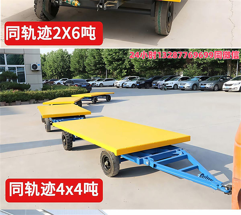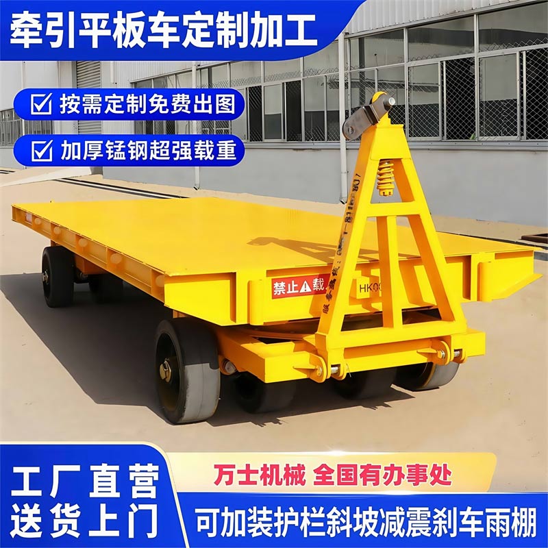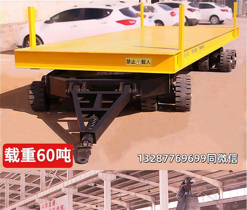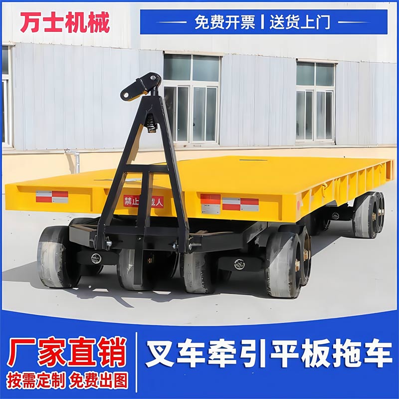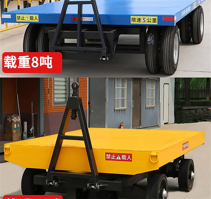 平板拖车是一种无动力装置的运输工具,通常由牵引车或叉车牵引,适用于工厂、码头、港口、仓库等场区内大宗货物的短途周转运输。平板拖车本身没有动力,需要外部动力源来驱动,这使得它非常灵活且适用于各种工业场所12。