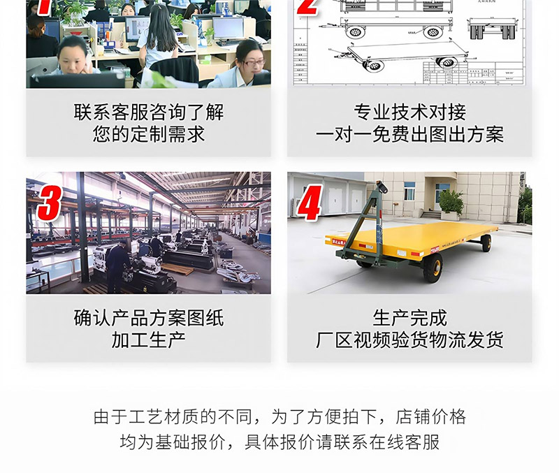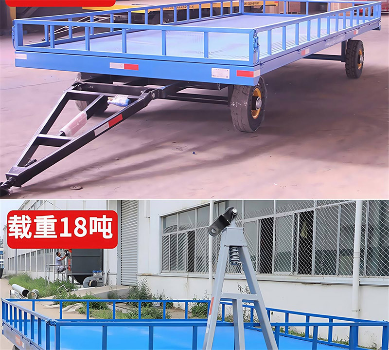 平板拖车通常由平板部分和牵引装置组成。平板部分用于承载货物,而牵引装置则用于连接牵引车或叉车,实现拖动功能。平板拖车可以根据客户需求进行定制,包括长度、宽度和高度等参数,并且可以添加围栏、减震、刹车等配件以适应不同的运输需求2。